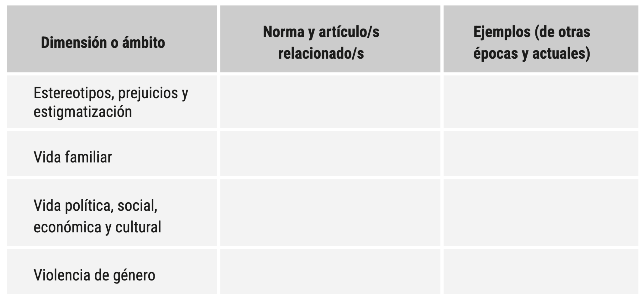 Tendréis que puntualizar con qué dimensión o ámbito de la discriminación de las mujeres y su desigual condición frente a los hombres se relacionan los artículos leídos. Así mismo, incorporad algunos ejemplos (de vulneración, de preocupación o de avance) extraídos del vídeo, de la conversación que se ha generado en el aula, de los materiales de otras épocas que se han analizado previamente y otros que sean de público conocimiento y actualidad, y con todo esto completad la siguiente tabla de información.