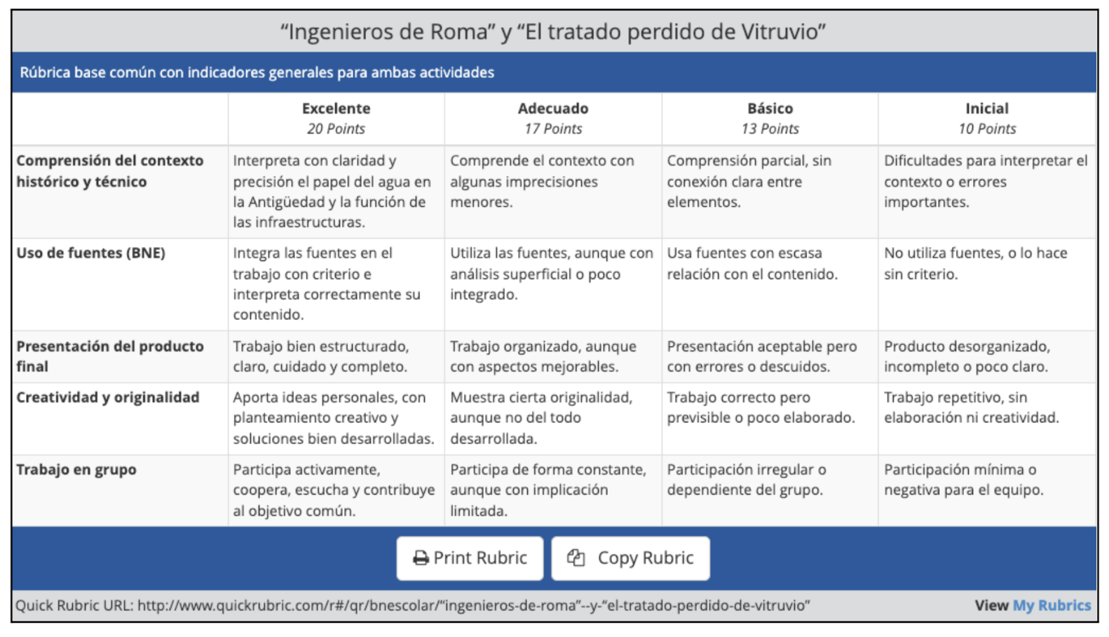 Por ejemplo, esto podría ser un posible comienzo: “En la ciudad de Augusta Emerita, el agua se perdía en los sifones. Para resolverlo, recomendé reforzar los conductos con piedra en vez de plomo, pues resistiría mejor las lluvias...” 3. Ilustración o elemento gráfico: El relato se puede acompañar de un dibujo del acueducto, un croquis o una "página escaneada" del supuesto tratado. 4. Presentación final: Leed vuestro relato en voz alta mientras proyectáis la ilustración o elemento gráfico creado. Para terminar, sigue las indicaciones de tu profesor o profesora para realizar una evaluación con la rúbrica que encontrarás más adelante o la que te proporcione. |