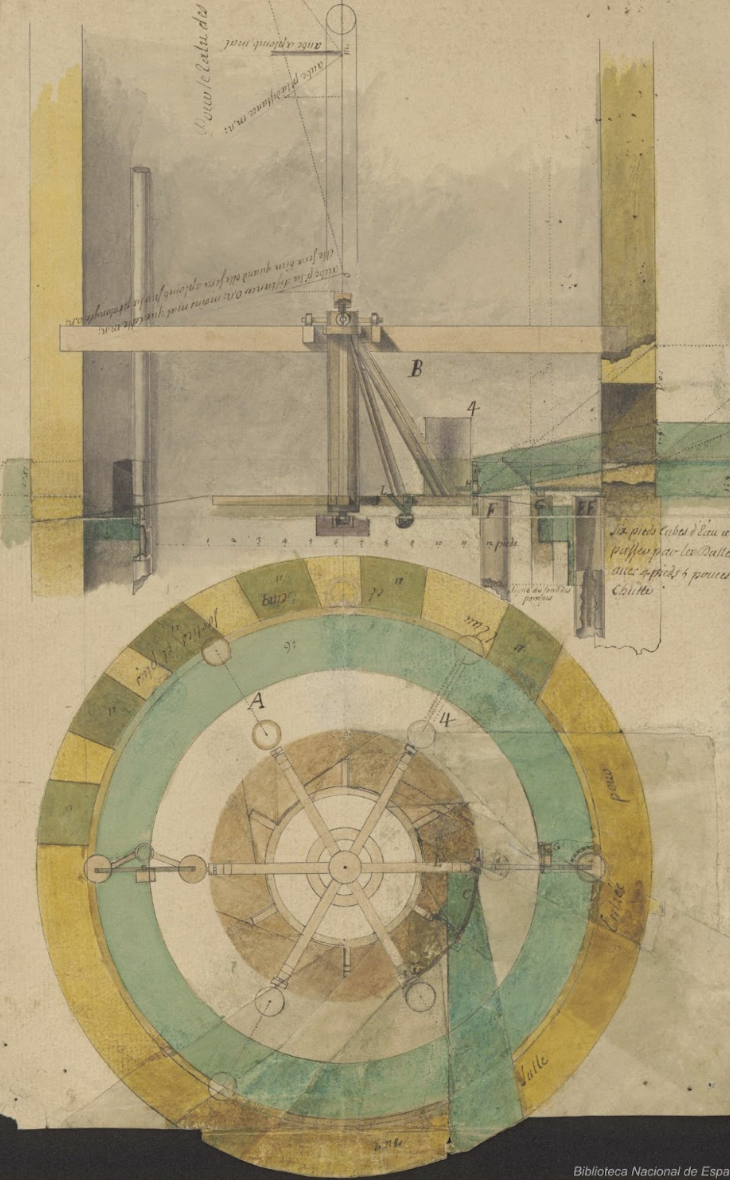 A continuación se presentan una serie de fuentes documentales y visuales conservadas en la Biblioteca Nacional de España que permiten explorar con más detalle este proceso de transformación en la gestión del agua durante la Edad Moderna. A través de tratados técnicos, grabados, esquemas de máquinas hidráulicas y reglamentos reales, es posible acercarse a los avances en la ingeniería hidráulica, a los modos de regulación institucional y a las representaciones visuales del agua como recurso organizado y controlado.